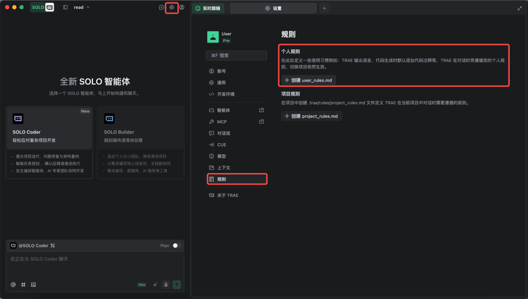 操作步骤: 进入 TRAE 设置页面→找到【规则】,创建个人规则→设置编程语言偏好、代码风格等→保存配置并重启 TRAE IDE