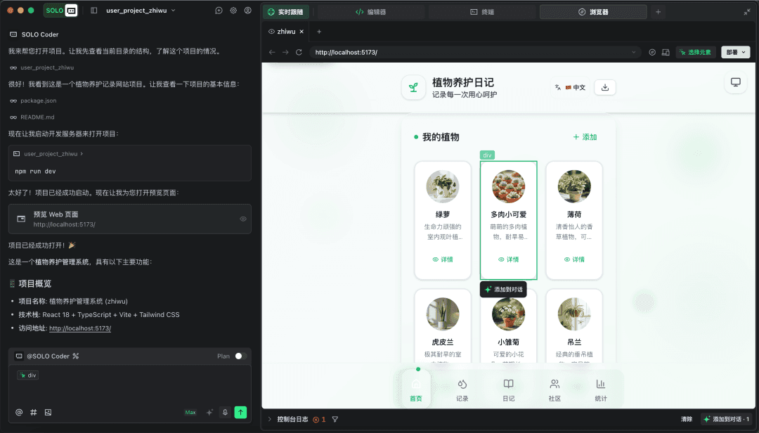 在 SOLO 的浏览器中,你可以通过右上角的【选择元素】选取 UI 元素,无需查看代码即可完成精准迭代。