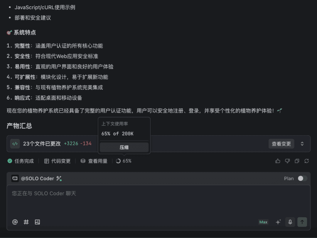 上下文是 AI 理解您意图的基础,过长对话会让模型“记不住重点”。SOLO 提供了上下文进度展示与压缩能力:当上下文过长时系统会自动压缩,你也可以手动触发,将冗余信息折叠起来,保留真正有价值的部分,让模型更聚焦。