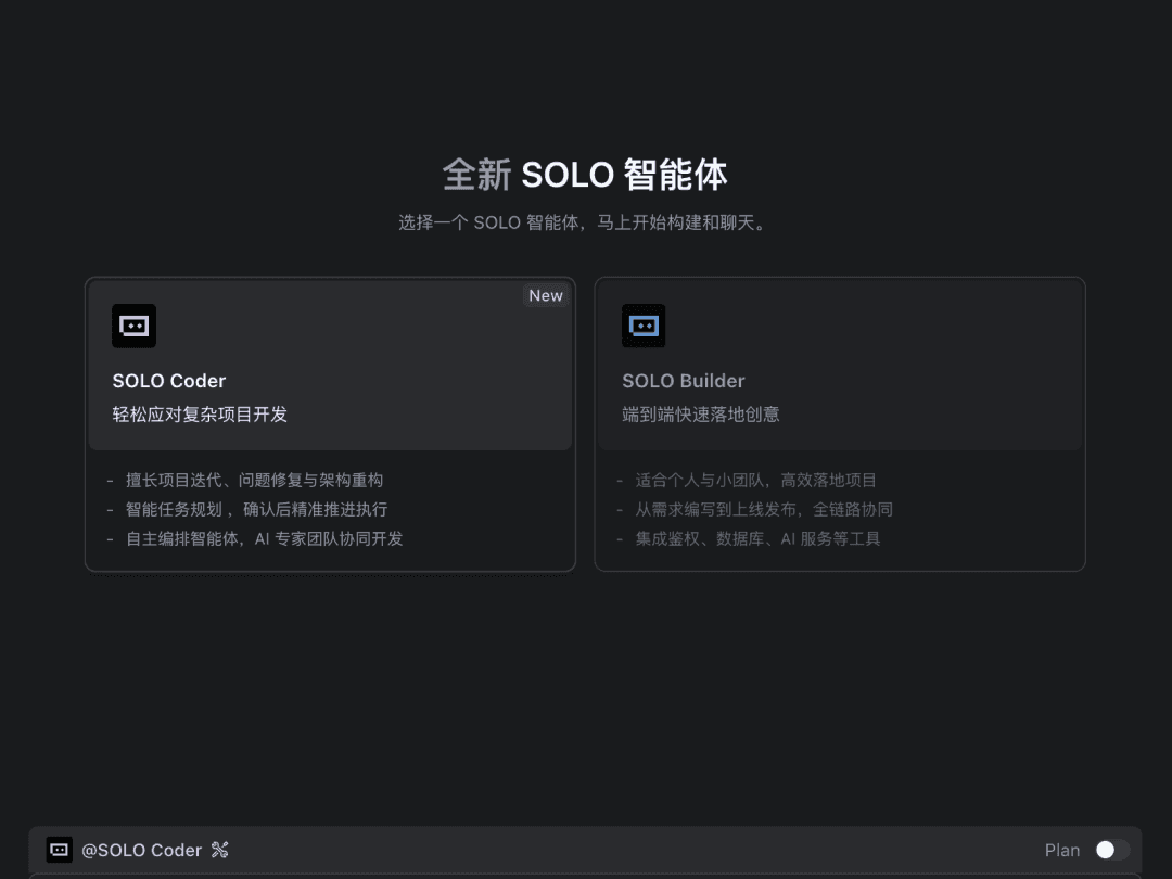 如果你想处理基于现有代码库的迭代、重构和 Bug 修复等复杂任务,SOLO Coder是最佳的选择,它具备优秀的项目理解和上下文管理能力,能够自动编排智能体协同开发。