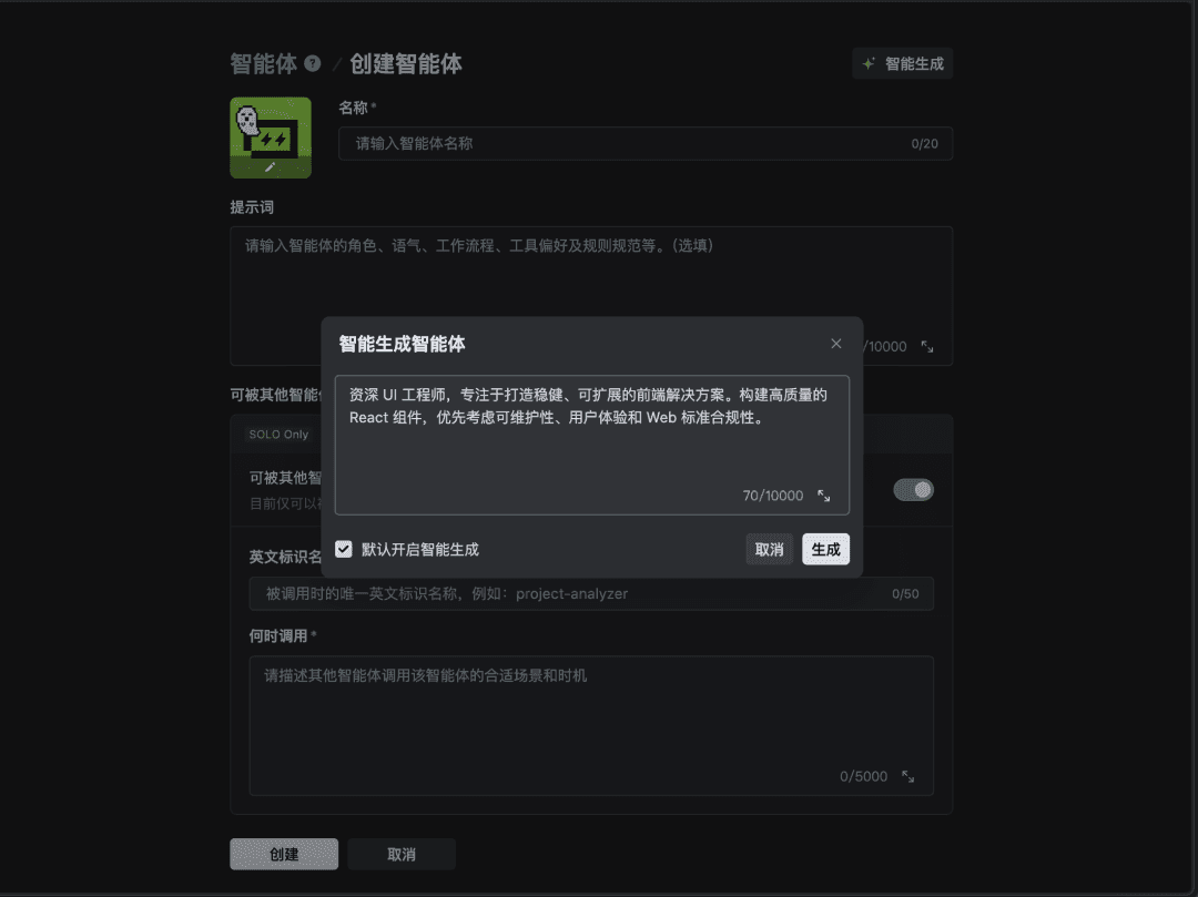 TRAE 的自定义智能体新增了智能创建能力,你只需要简单描述这个智能体的职责,AI 将自动补充详细的提示词和调用规则,完成智能体创建。