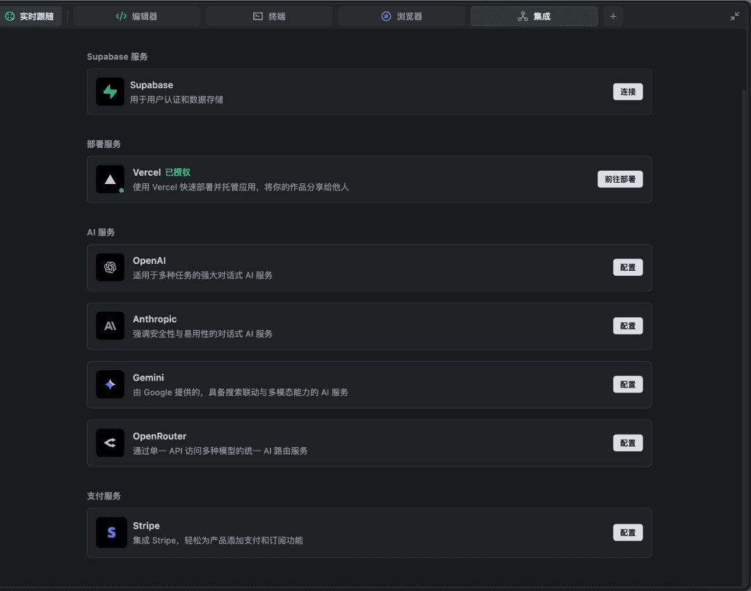 SOLO 集成了 Supabase、Figma、Vercel、Stripe、AI Service 等丰富的工具,你可以在同一空间内访问数据库、解析设计稿、一键部署、集成支付模块、配置模型服务,减少在不同应用间的反复切换。