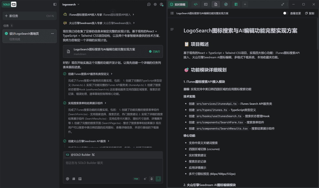 SOLO Builder做一个空壳小demo - 找APP logo的数据源 - 把一些规范封装成智能体 - 使用SOLO Coder制定开发计划 - SOLO Coder在原内容上进行开发 - 调试 - 部署。